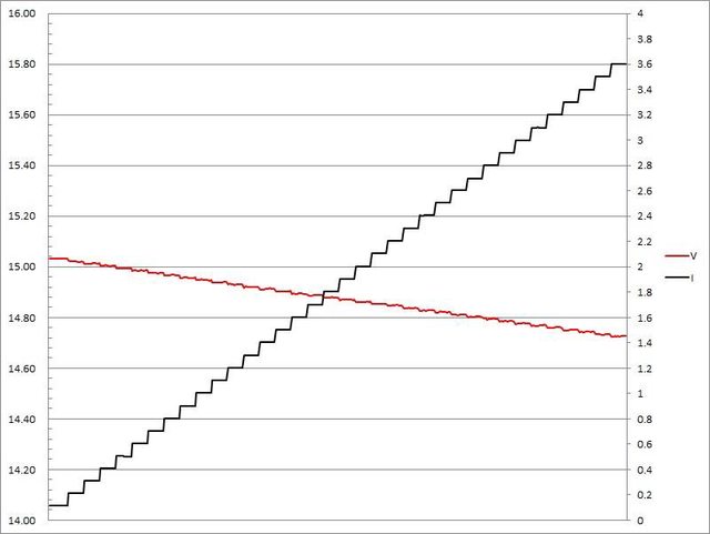 ▼USB-C搭配5A線材的固定檔15V輸出負載測試,隨著電流增加,輸出電壓下降,輸出電流