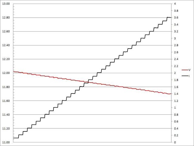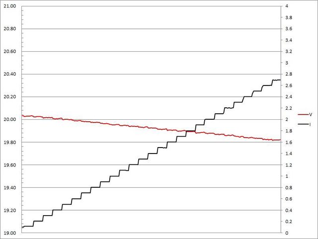 ▼USB-A的12V輸出負載測試,隨著電流增加,輸出電壓上升,輸出電流超過1.7A大幅壓降
