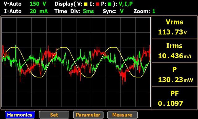 ▼USB-C輸出45W的交流輸入電壓/電流/功率波形如下圖所示