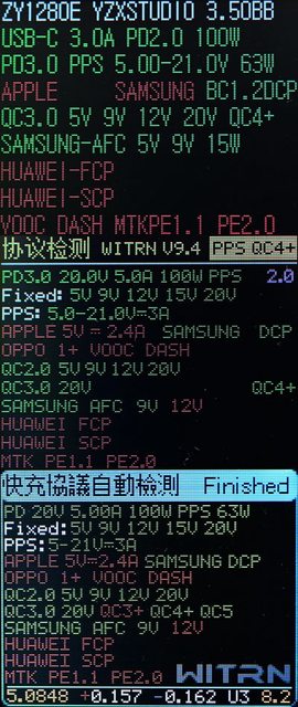 式下固定檔提供5V/3A、9V/3A、12V/3A、15V/3A、20V/2.25A,PPS檔提供5V-11V/3A