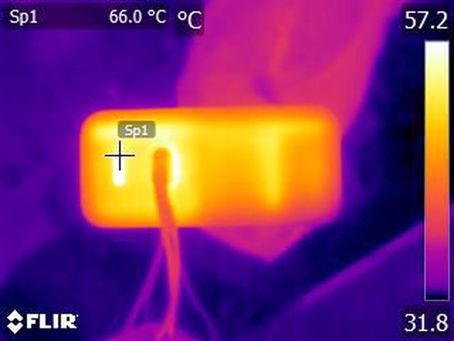 ▼單埠輸出100W一小時後充電器輸出埠的紅外線熱影像圖