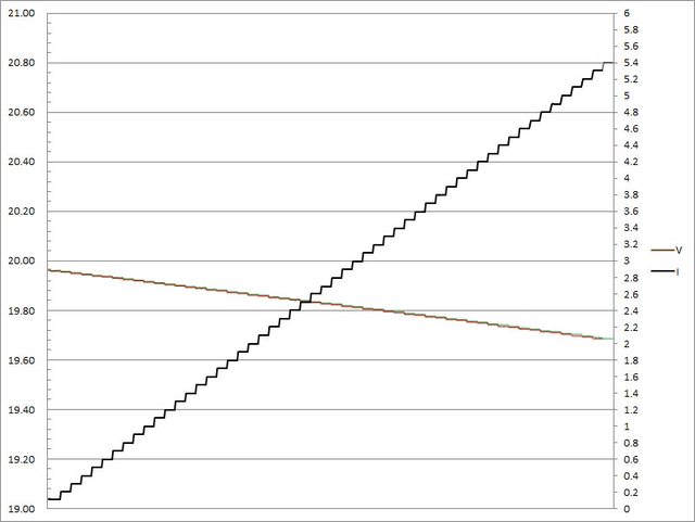 ▼C1(紅)/C2(綠)搭配5A線材的固定檔20V輸出負載測試,隨著電流增加,輸出電壓下降,