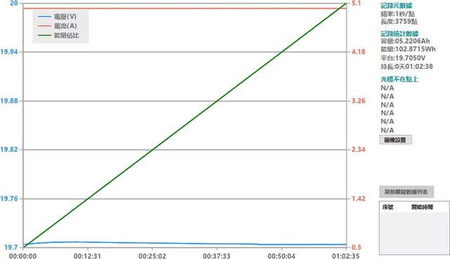▼單埠輸出100W可連續維持一小時不中斷,輸出電壓變動程度如圖表藍線所示