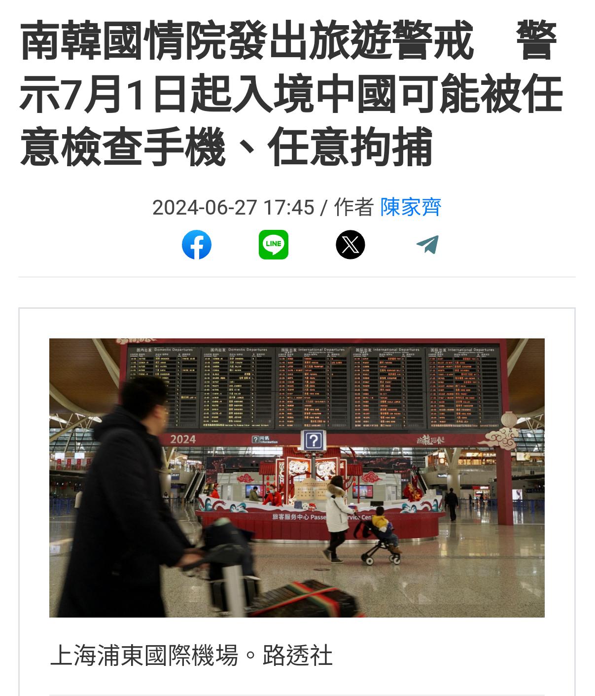 推 sam6503qpx : 南韓國情院發出旅遊警戒 警示7月1日起入境中國可能 06/29 12:41