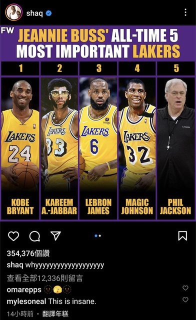 → sony0223098 : 這是湖人歷史耶 姆斯在湖人比俠客好? 07/06 06:58