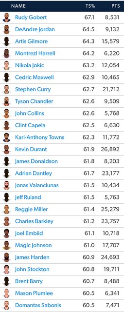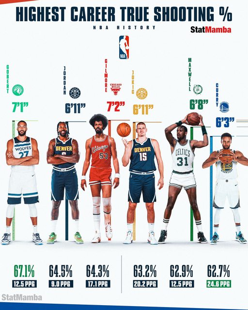 https://twitter.com/StatMamba/status/1710437206752374880 Highest Career True Shooting % in NBA History: 67.1% — Rudy Gobert (12.5 PPG) 64.5% — DeAndre Jordan (9.0 PPG) 64.3% — Artis Gilmore (17.1 PPG) 63.2% — Nikola Jokic (20.2 PPG) 62.9% — Cedric Maxwell (12.5 PPG) 62.7% — Steph Curry (24.6 PPG) http://i.imgur.com/JZUxczl.jpg