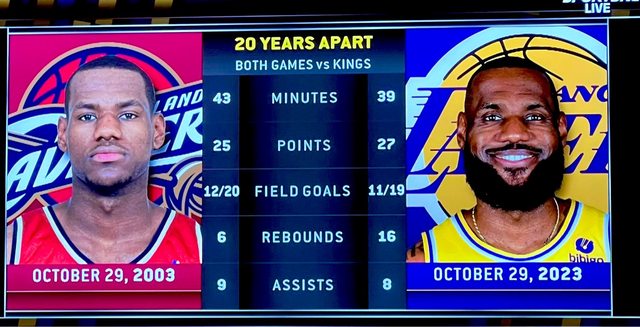 為了紀念LBJ的首秀20週年,國王送LBJ一瓶紅酒、一雙球鞋以及首秀的裱框相片。 LeBron在20年前的今天打了生涯首場比賽,一樣是對上國王,20投12中拿下25分6籃板9助 攻。 https://i.imgur.com/Q2SRsZ5.jpg