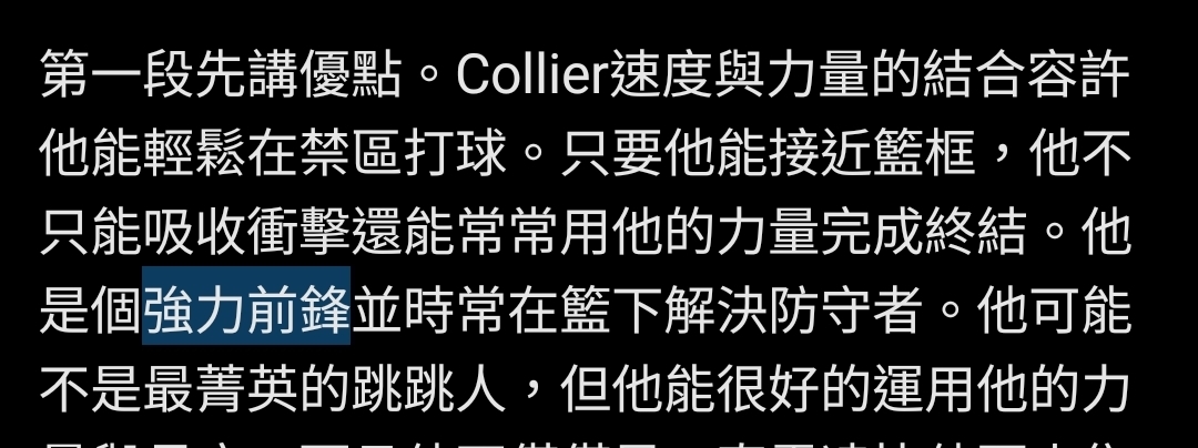 第一段先講優點。Collier速度與力量的結合容許他能輕鬆在禁區打球。只要他能接近籃框