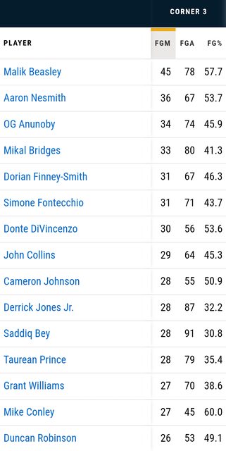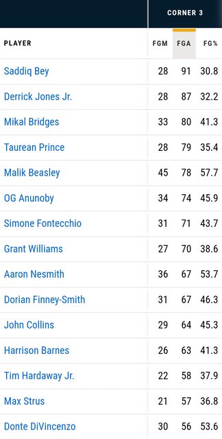 https://twitter.com/NBA_University/status/1741903506519261434 Most Corner 3PA: 1. Saddiq Bey: 91 FGA—30.8% cold... 2. Derrick Jones: 87—32.2% 3. Mikal Bridges: 80—41.3% 4. Prince: 79—35.4% 5. Beasley: 78—57.7% on fire! 6. Fontecchio: 71—43.7% 7. Anunoby: 70—44.3% 7. Grant Williams: 70—38.6% 9. Nesmith: 67—53.7% 9. Finney-Smith: 67—46.3% Corner Campers 本季出手最多底角三分的球員 (直接從NBA.com截圖) http://i.imgur.com/2dy3mYw.jpg