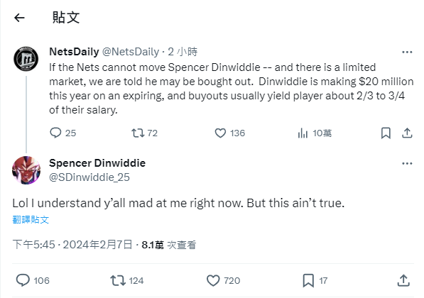 推 harrybbs : Spencer Dinwiddie himself debunked some buyout 02/08 11:27