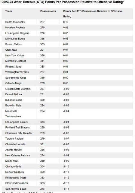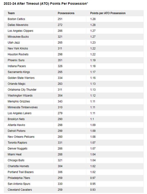 以下是所有 30 支球隊在暫停後的情況下每次控球得分的情況(所有數據截至 2024 年 2