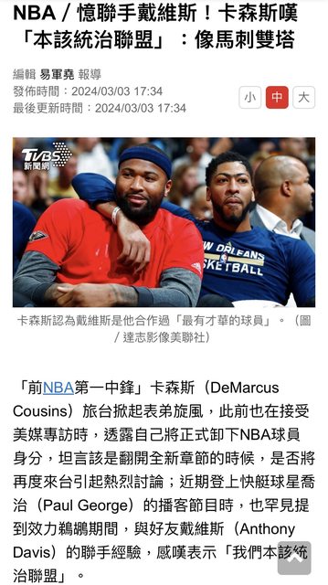 推 JayFans0610 : 說實話,Cousins跟AD的組合確實算滿有想像空間的 03/04 20:35