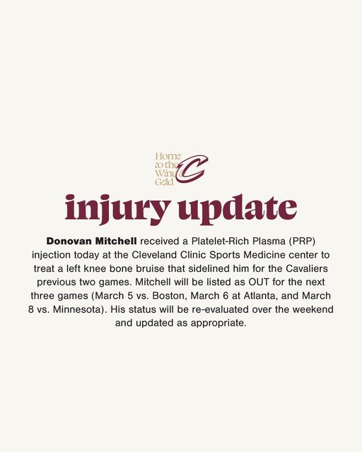 Donovan Mitchell今天接受了PRP治療來應對讓他前兩場比賽缺席的左膝骨挫傷。他接下來三