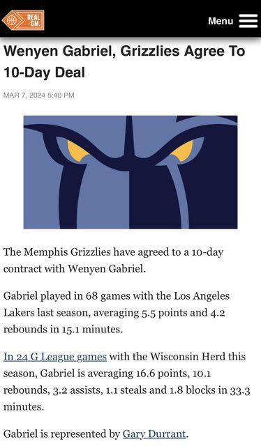 曼非斯灰熊隊昨天以10天合約,簽下可兼打4-5號位的Wenyen Gabriel
