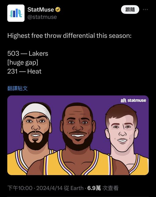 推 LanewGo : 溜馬禁區得分第一,湖人第二,為啥麼罰球差了快一千 04/15 01:07