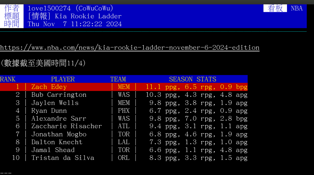 推 gm79227922 : 這屆都不是很強啊 現在領跑的是Edey 11/17 13:59