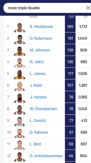 他NBA生涯的大三元次數可以在聯盟排在第12名(46次,第11名為L.Bird-59次),