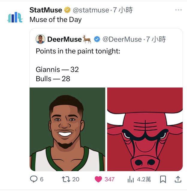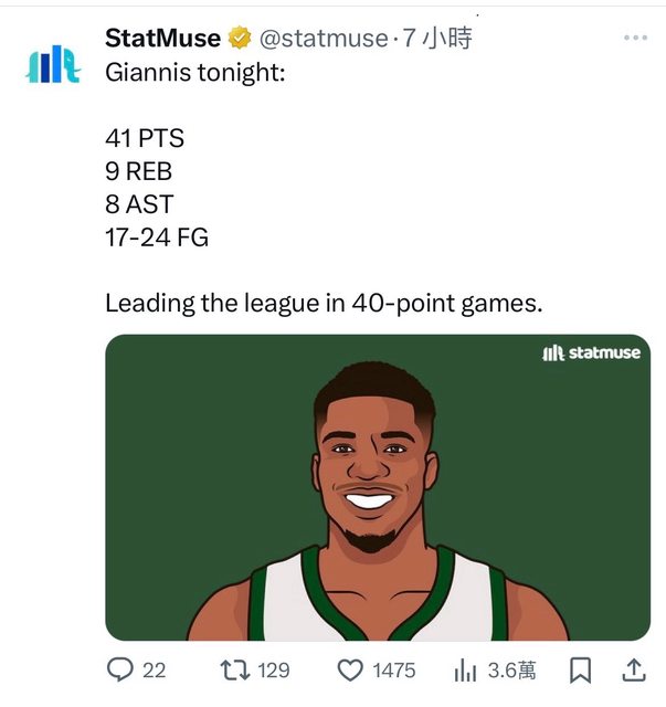 今天鹿王-字母哥Giannis繳出41分9籃板8助攻的準大三元成績,