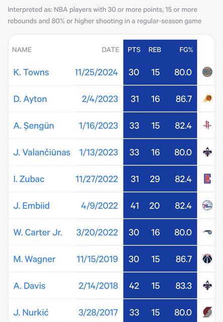 這是2002年的Kurt Thomas之後,第一位達到單場30分-15籃板-8成命中率的尼克球員
