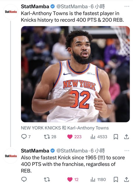 如果不計籃板,KAT尼克生涯累積400分的效率,也是自1965年的最快