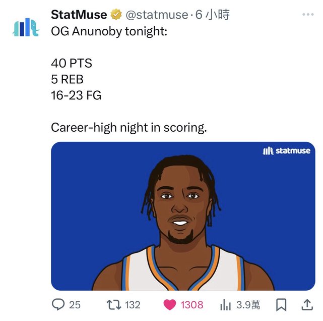 今天尼克隊前鋒OG Anunoby在客場對丹佛金塊的比賽中,