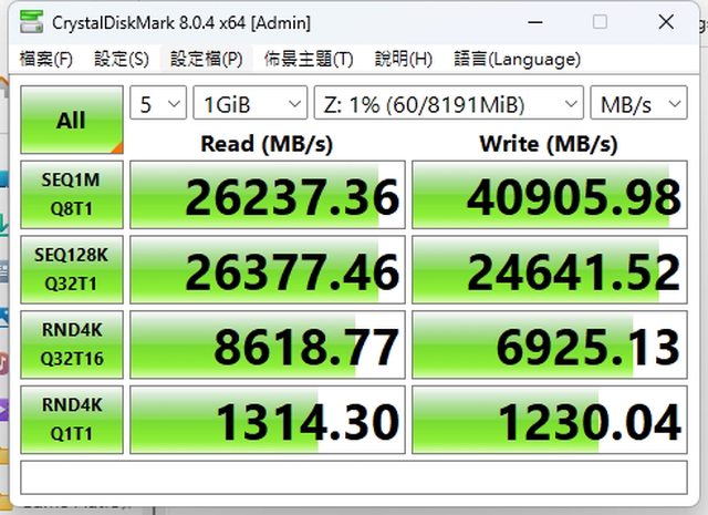 讀取 26237.36MB/s 寫入 40905.98B/s