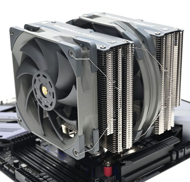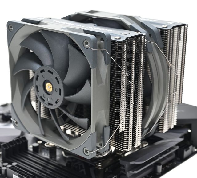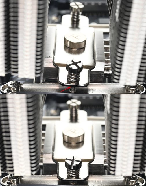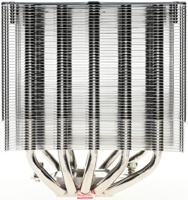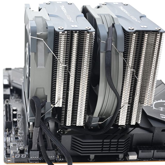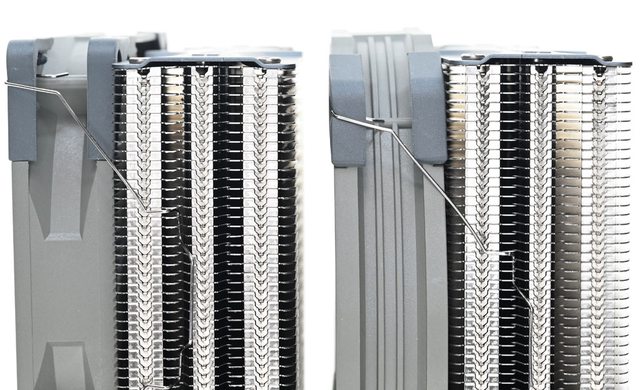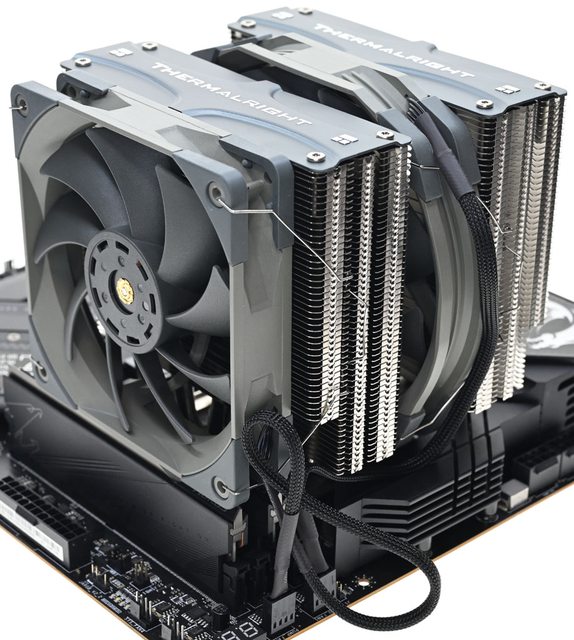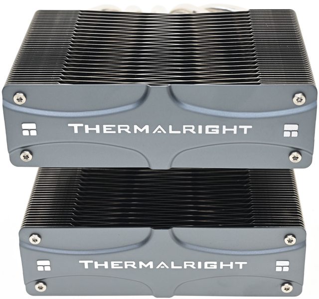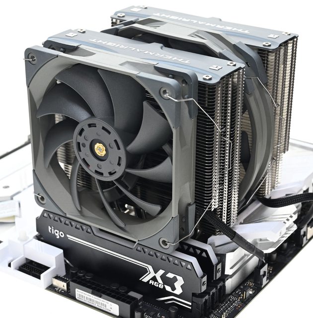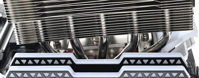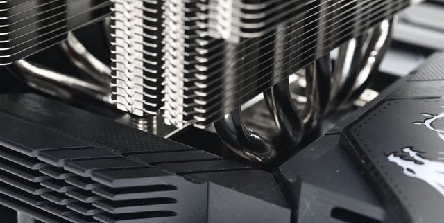 ▼從側面看雙塔結構,前塔及後塔下方12片散熱鰭片縮小,提供記憶體閃避空間,壓板中