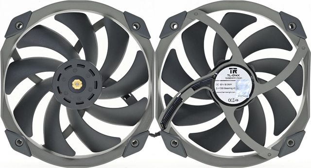 ▼TL-D14X風扇,使用S-FDB軸承,9葉片扇葉中心露出金屬轉子軸心,外框中心標籤上有
