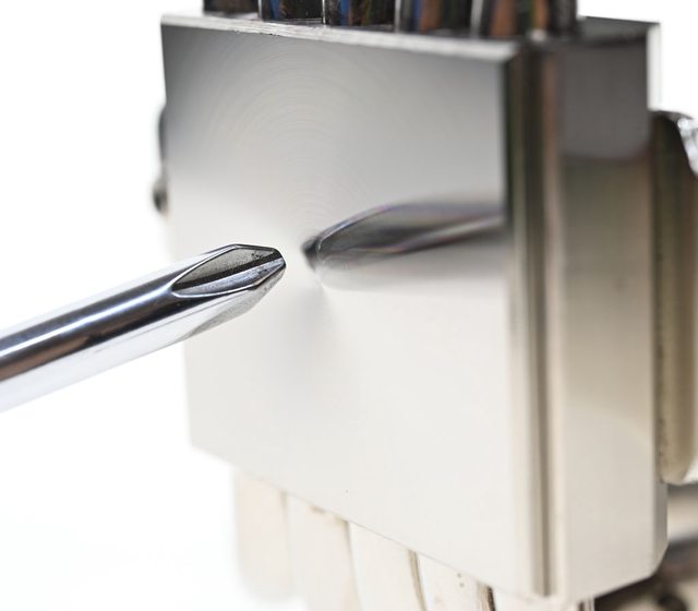 ▼雙塔最上方用銀色星形螺絲固定的深灰色金屬裝飾蓋有裝飾紋路、鋁原色商標及名稱