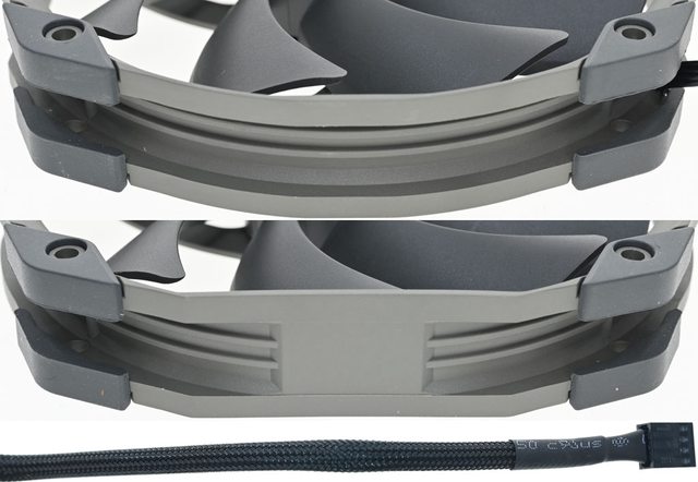 ▼風扇外框兩面的螺絲孔處有防震膠墊。風扇4pin PWM線路外面包覆編織網