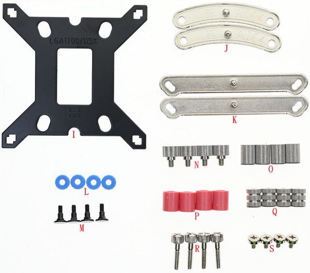 Intel LGA1700托架固定柱(Q)、AMD托架固定手轉螺絲(R)、Intel托架固定螺絲(S)