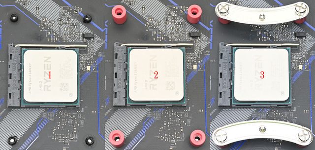 (1),將4個紅色套管套進原裝散熱器背板鎖點(2),放上AMD AM5/AM4托架,對準孔洞插入