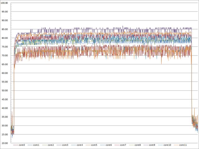 ▼高負載30分鐘CORE TEMP溫度記錄圖