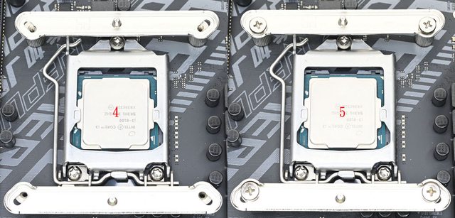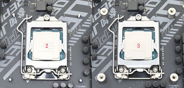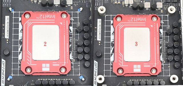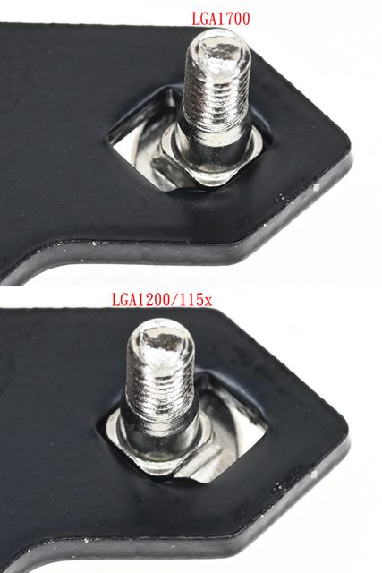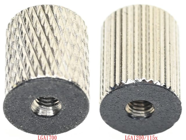 ▼LGA1700托架固定柱(左)為斜線壓花,LGA1200/115x托架固定柱(右)為直條紋溝槽,托