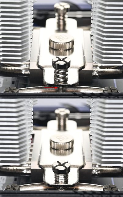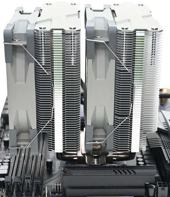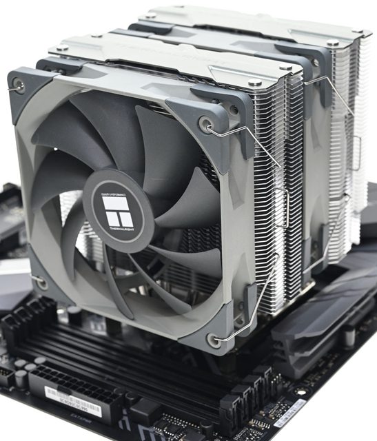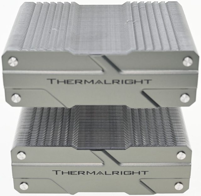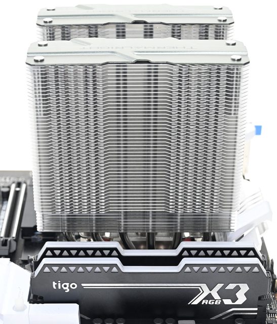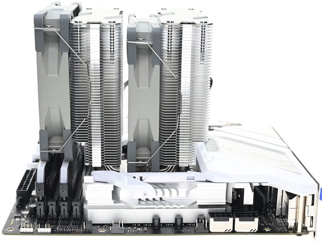 ▼從側面看雙塔結構,前塔及後塔下方9片散熱鰭片縮小,提供記憶體閃避空間,壓板中