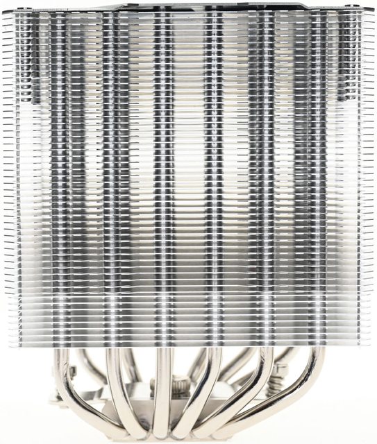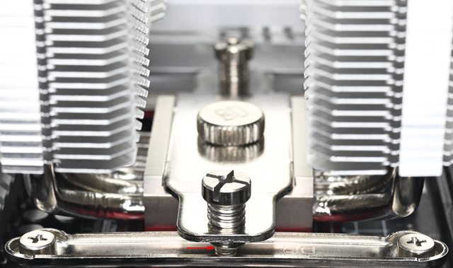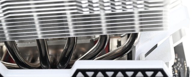 ▼散熱器本體採雙塔設計,底座兩邊各伸出6支直徑6mm無重力熱導管,並在熱導管上安裝