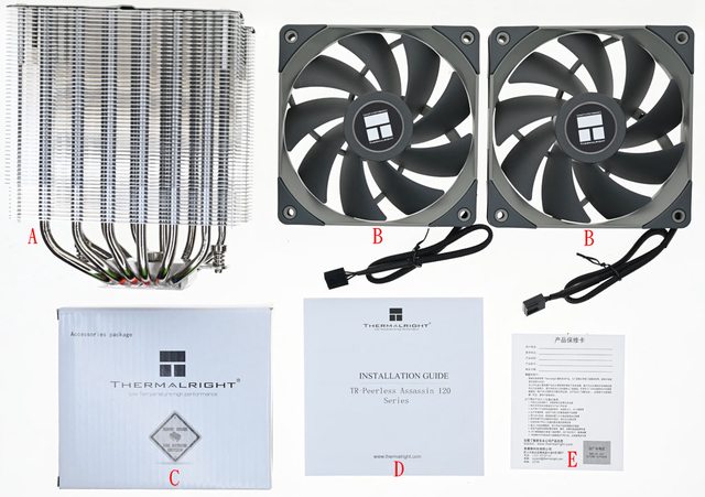 ▼包裝內容有散熱器(A)、TL-C12風扇(B)、安裝配件盒(C)、安裝說明書(D)、保證卡(E)