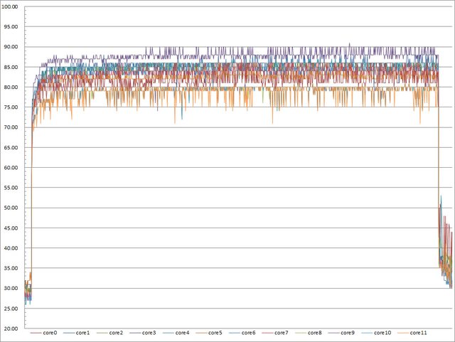 ▼高負載30分鐘CORE TEMP溫度記錄圖