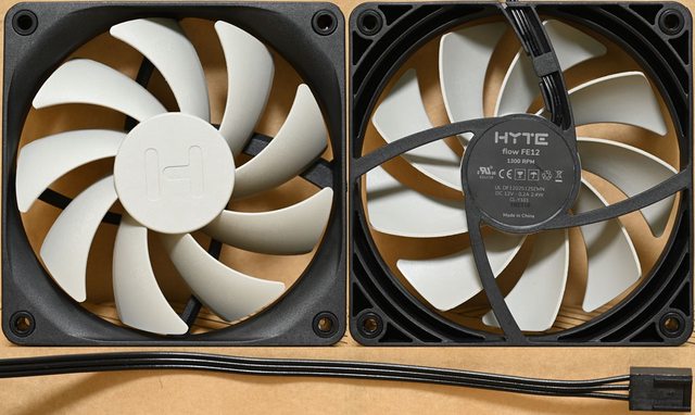 ▼HYTE flow FE12 1300RPM風扇,型號DF1202512SEMN,灰色扇葉軸心處有HYTE商標,黑