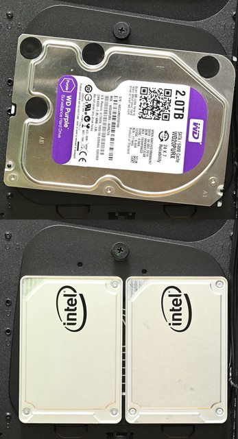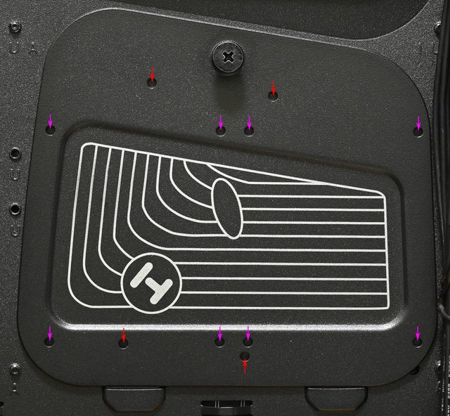 ▼3.5吋/2.5吋固定板上面的3.5吋硬碟(紅色箭頭)及2.5吋SSD(紫色箭頭)固定孔