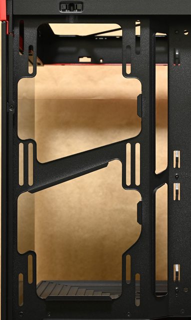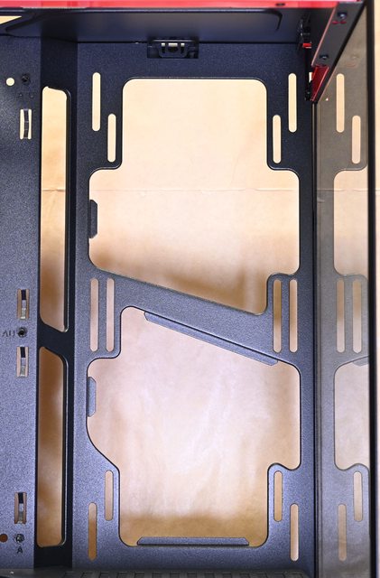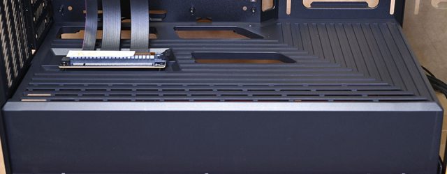 質顯示卡專用直立延長線已預先安裝在內部,底板最上方有1個長條形穿線開口,底板鏤