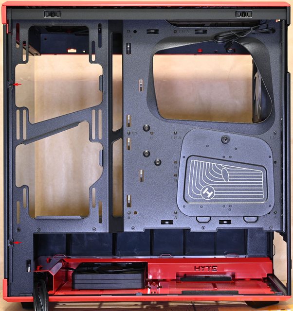 ▼底部前方預裝1個HYTE flow FE12 1300RPM風扇,電源供應器安裝位置內部機殼金屬架