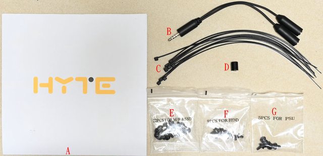 柱套筒工具(D)、主機板銅柱/2.5吋螺絲(E)、3.5吋螺絲(F)、電源螺絲(G)