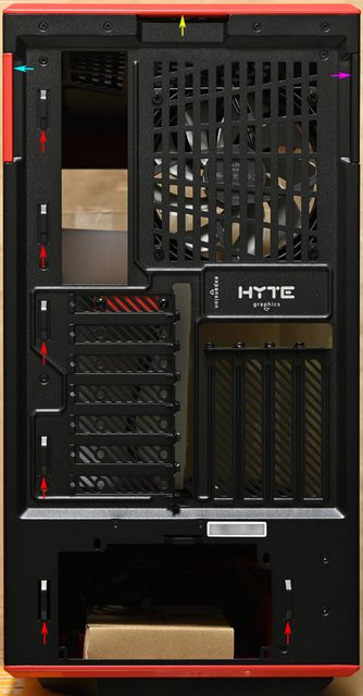 ▼機殼後方,最上面有打開左側板(紫色箭頭)/右側板(水藍色箭頭)/頂部蓋板(黃色箭頭)