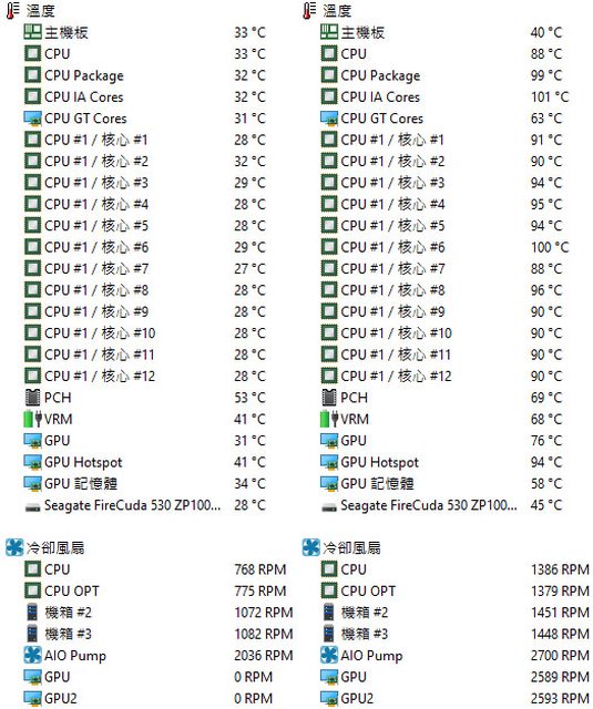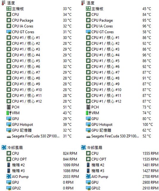 ▼CPU+GPU高負載前(左)及高負載30分鐘(右)的AIDA64 Extreme感測器各部溫度比較