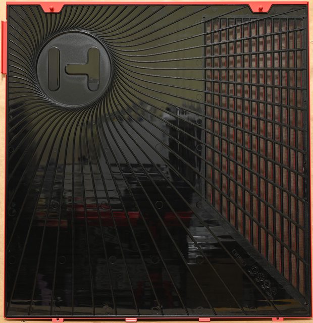 ▼右側板內側左上方有商標及放射狀紋路造型,右方通風口配置不可拆卸的過濾網