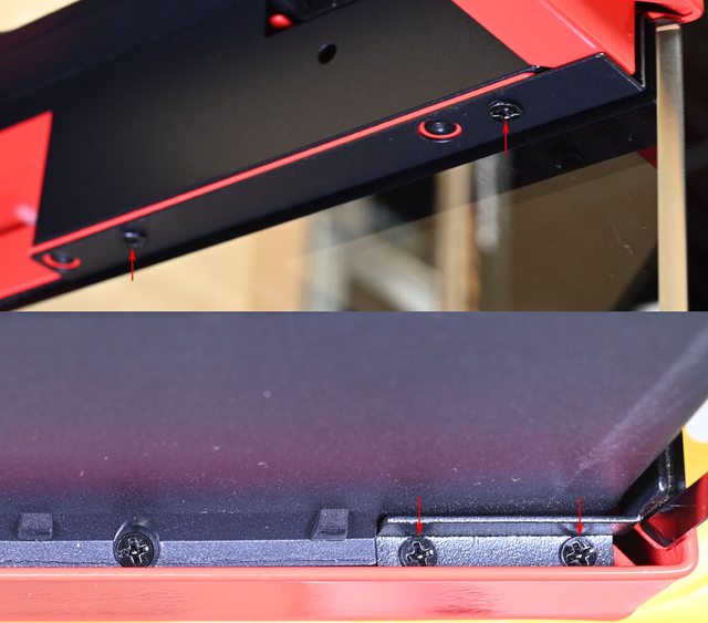 ▼機殼右側配置如下圖所示,右方邊緣有正面強化玻璃面板的2個固定螺絲(紅色箭頭)