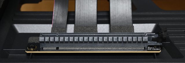 ●機殼內附支援PCIe 4.0 x16的高品質顯示卡專用直立延長線,主機板插槽連接處設置外