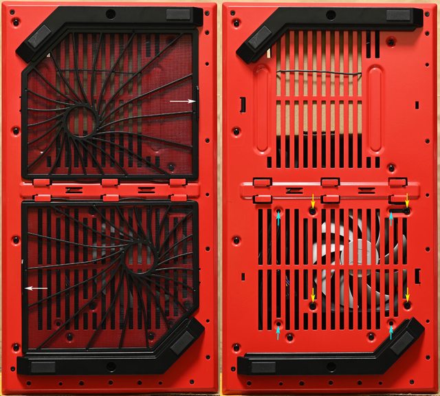 濾網)及右側(前方濾網)抽出/插入。底部前方通風口可裝1個120mm(黃色箭頭鎖點)或