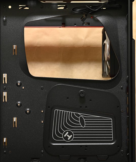 的上面有整線固定支架及鏤空商標字樣,安裝長度160mm的電源供應器後,底部風扇與電